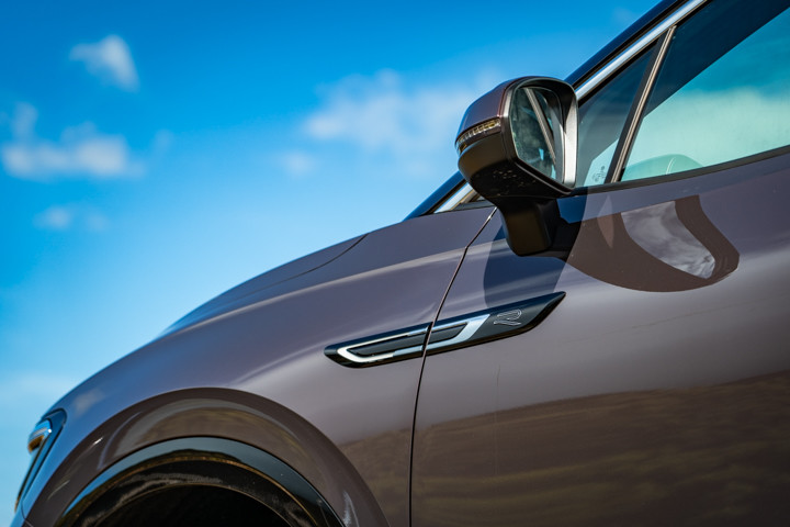 揽境侧面与前脸一样采用了较为柔和的线条过渡处理,大角度倾斜的A柱配合缓慢下滑的车顶线条以及长后悬的设定,在视觉观感上更像是一台跨界MPV。同时揽境也延续了一汽-大众SUV产品在车顶覆盖镀铬饰件的“家族传统”,丰富了整个车身侧面的立体感。