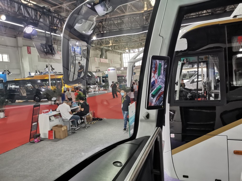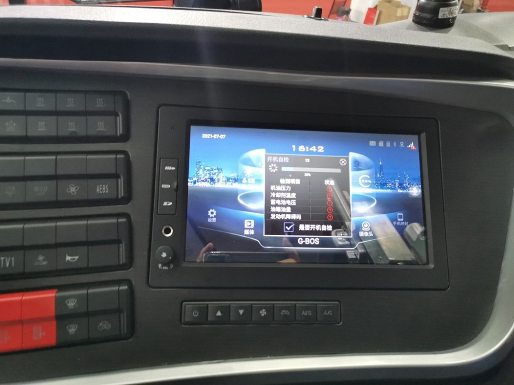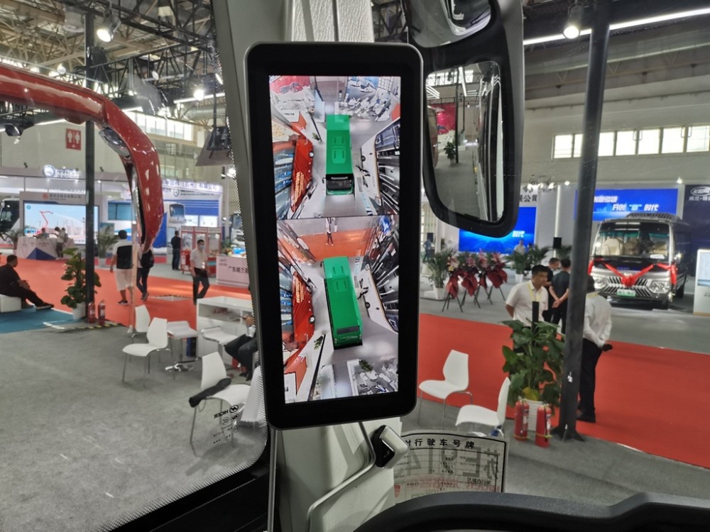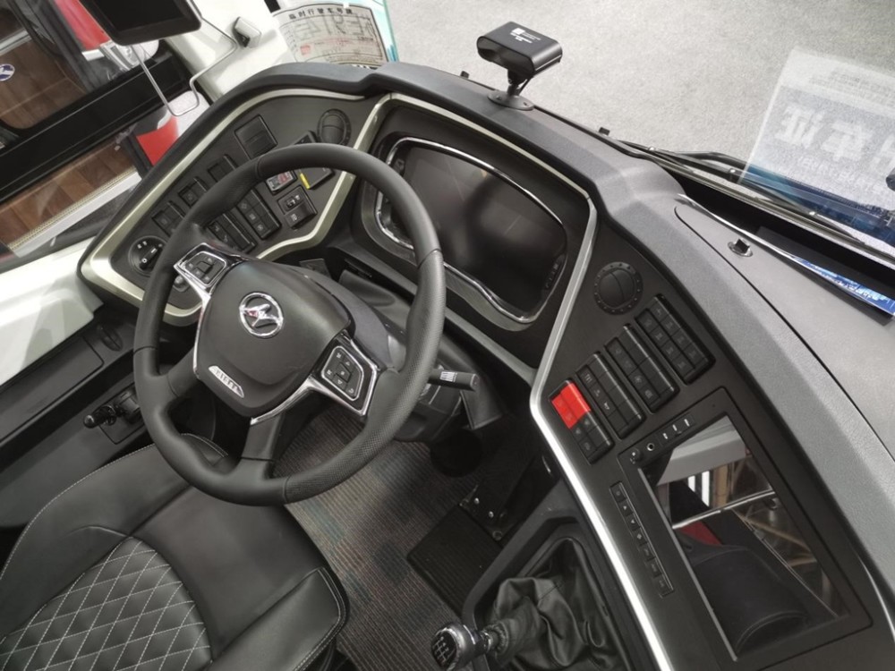 液晶显示屏在发动机启动的时候会显示出海格的标志和HIGER字母,随后就显示出仪表指针,左侧显示转速表和水温表,右侧显示速度表和油表。如果电源接通后发动机不启动,显示的就是时间和日期,背景是黑色天空中一个蔚蓝的城市,画面简洁却富有深意。在驾驶员的右侧还设有10.1寸液晶屏,液晶屏功能繁多,车载多媒体系统缓解了旅行家的疲惫。展车上除了装有传统后视镜,车上还装有电子后视镜,发动机启动时显示绕车检查的画面。
