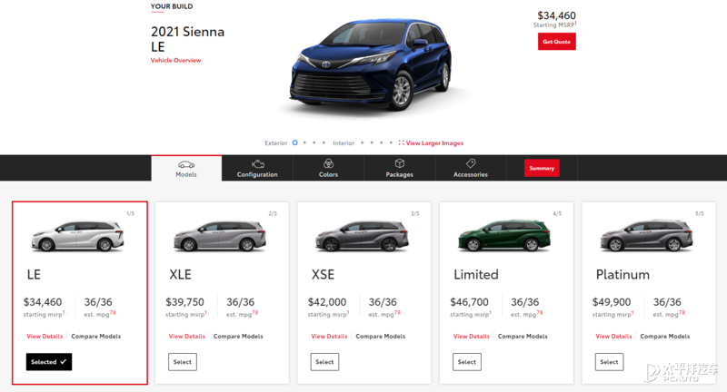 国产丰田赛那起售价真的只要20+万,共5款配置车型;