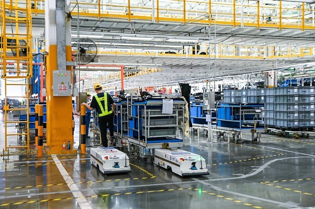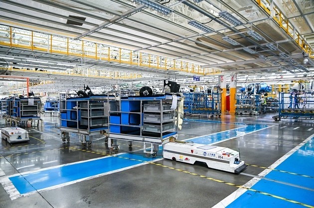 智能AGC自动化系统通过自动导引、自动搬运、与线体自动无缝对接,整套系统无需人工干预,且具备自动充电和安全防撞功能。总装车间大量导入AGV小车,实现物料无人化运输移栽。