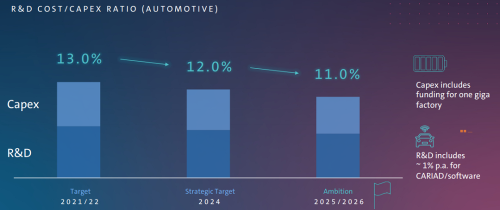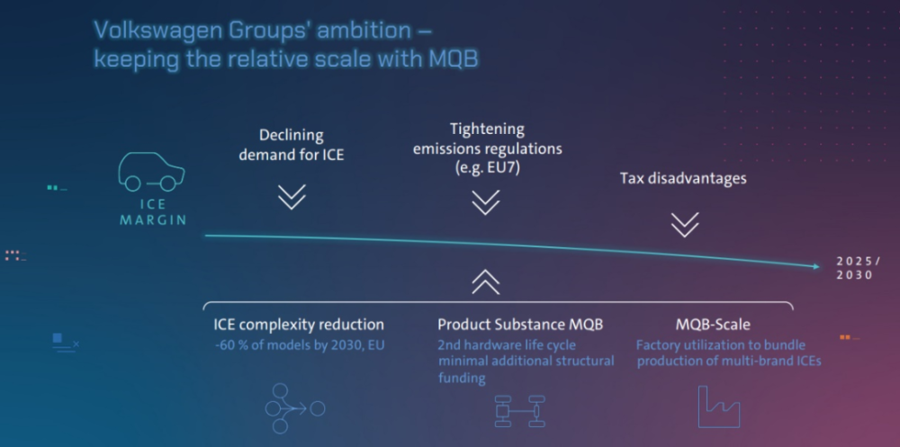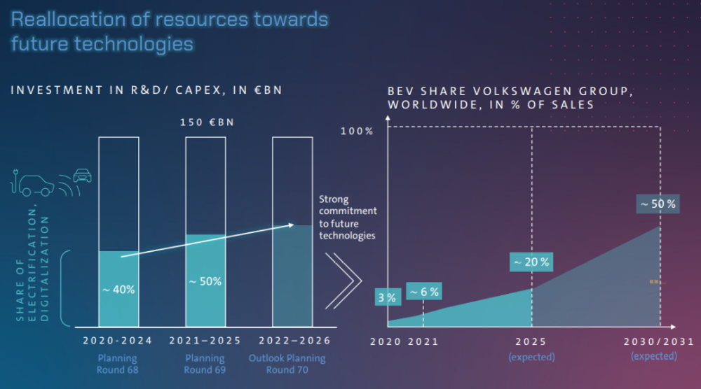 如下图所示,大众最重要的还是持续把集团内的资源不断投给未来。欧洲汽车企业里面,目前再没有人认为之前全力推进MEB纯电动平台是错误的选择,在这帮“同僚”面前,大众是做了正确的判断并且占据了先手,然而目前来踢馆的可是前进、前进、再前进的特斯拉啊。所以能看到大众集团的研发资源大部分还是继续往电气化和软件两个方向投入,哪怕纯电动只是占据销量的3%、6%,甚至预计2025年也只有20%。资源配置的比例,规划上逐步从40%提高到50%,甚至更高。