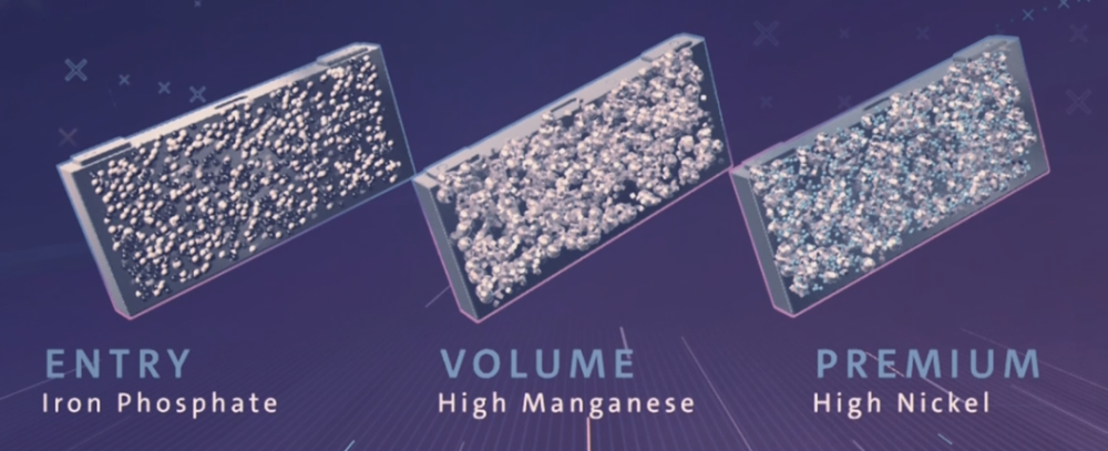 根据大众集团不同品牌的定位和产品序列,大众的电池技术路线是采用3种不同的材料体系来应对不同的市场定位,分别为入门级磷酸铁锂、走量型的高锰和高端型的高镍。
