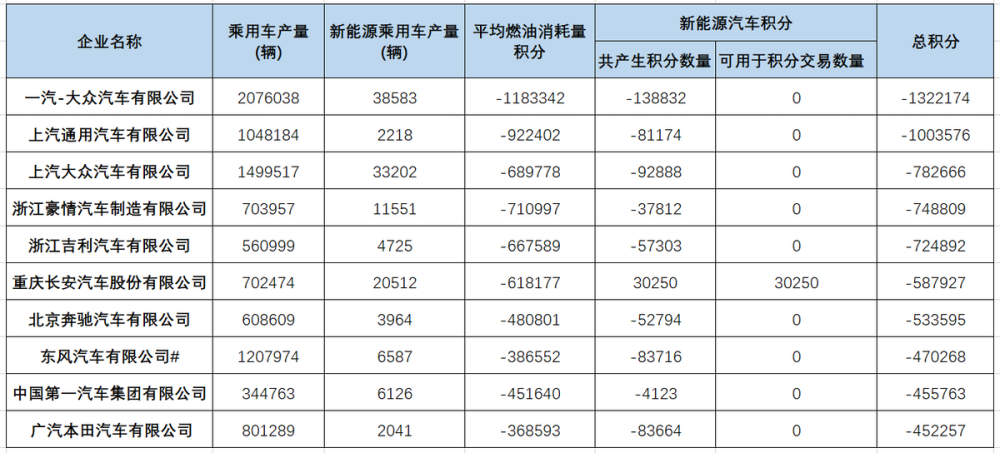 写在最后:从负积分排名前十的车企情况可以看出,合资品牌、豪华品牌大多都是由于销量主力放在燃油车上,并且销量巨大,对新能源一直保持观望,行动缓慢,以至于在市场没有了先发优势;自主品牌中像吉利、长安较早涉足新能源,但都因为各自的原因,销量不及预期,并且燃油车的燃油消耗量还有进一步减少的空间;而东风、一汽主观上看到了新能源的趋势,但因为体制原因,客观上很难迅速转型。虽然车企们销量高企,但高达几十万甚至上百万的负积分,也需要花费高额的成本才能抵消。把购买的积分的费用花在推动新能源车的发展上,岂不是更好呢?(文/优视汽车 老炮)