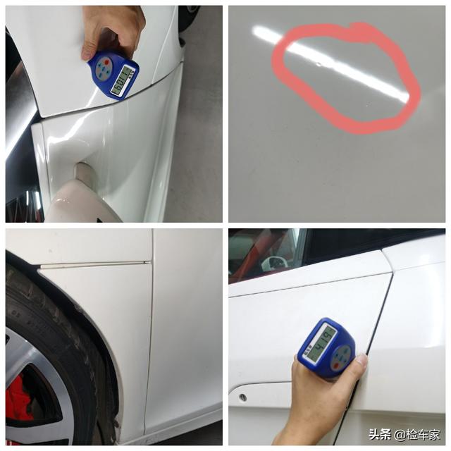 右侧车门也同样存在腻子修复,而右侧叶子板也和左边的一样有喷漆和调整的痕迹。