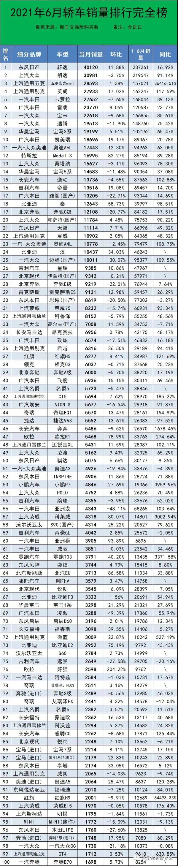 车矩阵车评:近日,基于新车交强险购买数而来的国内乘用车销量排行榜新鲜出炉,数据显示2021年6月国内乘用车销量为169.8万辆,环比增长0.15%,同比增长约3.04%,1-6月累计销售1046.9万辆。其中国内轿车销售83.6万辆,占比为49.23%,环比增长2.83%。