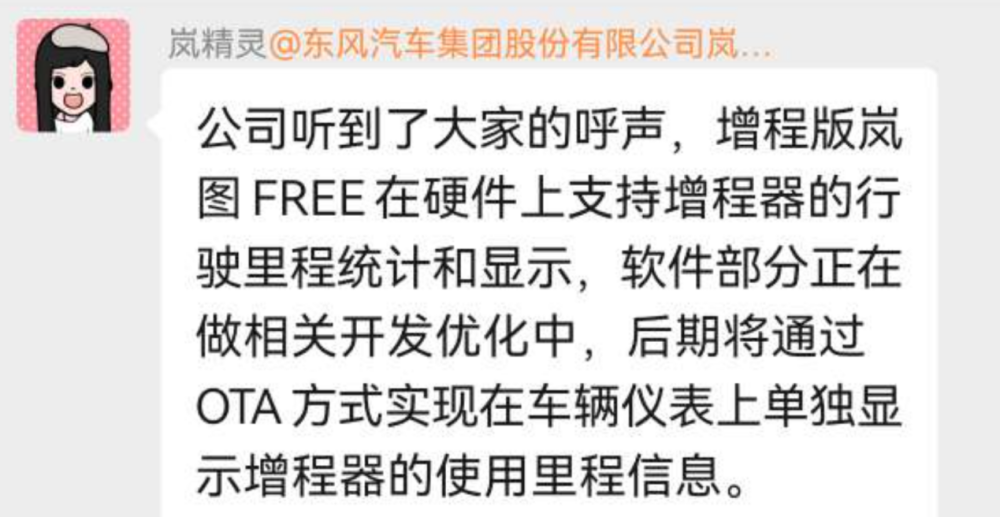 岚图品牌的用户交流团队也不是吃素的,比如说前段时间有个预定车主,他觉得岚图FREE应该增加一个增程器使用里程的统计与显示功能,就向岚图官方做了反馈。对于这个反馈,岚图官方比较重视,并且很快给出了答复。岚图工作人员表示,岚图FREE增程版的硬件其实是支持显示增程器行驶里程统计和显示的,不过此前在软件方面并没有做出对应优化。而在用户提出这个问题之后,岚图已经开始对相关功能进行软件层面的开发优化了,后续岚图品牌会通过OTA升级的方式,实现在车辆仪表盘上单独显示增程器使用里程信息的功能。