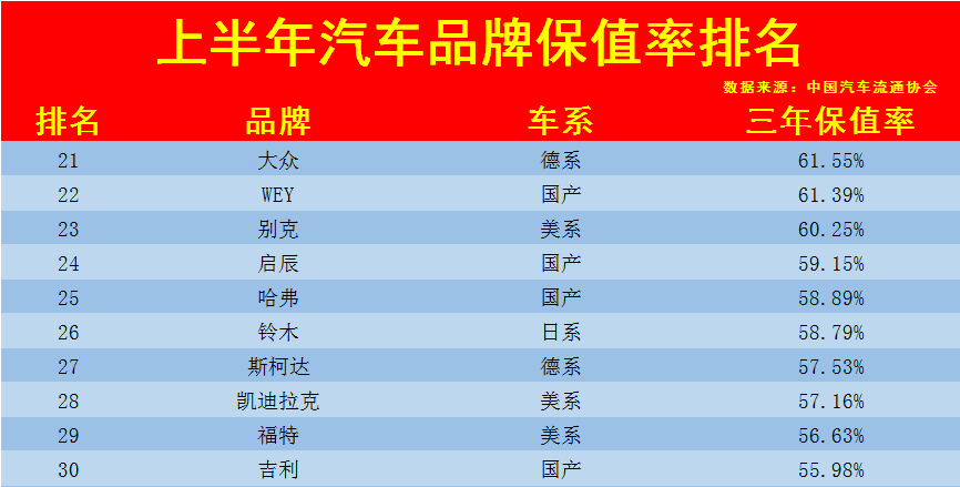 最后来看下榜单的21-30位,让人比较意外的是大众、别克和吉利汽车,大众和别克都是国内知名合资车品牌,年销量都在百万辆以上,但它们的保值率却低得可怜,排名也是跌出了前二十。国产车品牌吉利汽车,此次居然是排名垫底(第三十名),其三年保值率只有55.98%。另外,斯柯达、凯迪拉克和福特汽车的保值率表现也很一般,国产品牌WEY、哈弗以及启辰汽车,此次也都是榜上有名。