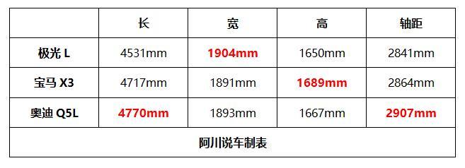 我们先通过一组数据来横向对比下,看看加长后的极光L在这一细分市场,处于什么样的水平?具体来看,极光L的长宽高分别为4531/1904/1650mm,轴距2841mm。从下面的表格可以看出,即使加长后的极光L,其“块头”相比同级豪华中型SUV,还是有一定距离。特别是和奔驰GLC、奥迪Q5L有明显差距,相比之下,和宝马X3较为接近,因为本身X3主打的也不是空间,而是运动。