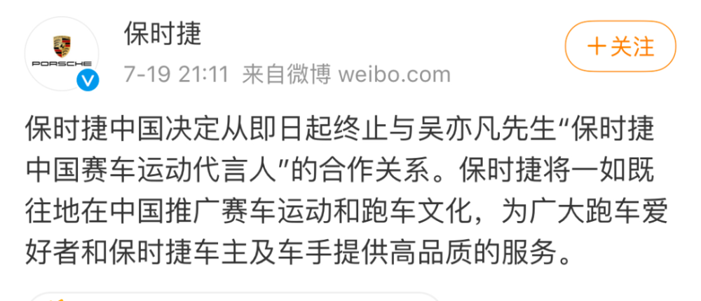 保时捷作为他唯一代言的汽车品牌,7月18日(舆论发酵的当天),吴亦凡还现身宁波赛车场参加了保时捷举办的赛道活动。继多位品牌方解约后,保时捷最终也坐不住了,于7月19日晚上官宣“终止与吴亦凡先生保时捷中国赛车运动代言人”的合作关系。并强调,一如既往的在中国推广赛车运动和跑车文化,为广大跑车爱好者和保时捷车主及车手提供高品质的服务。