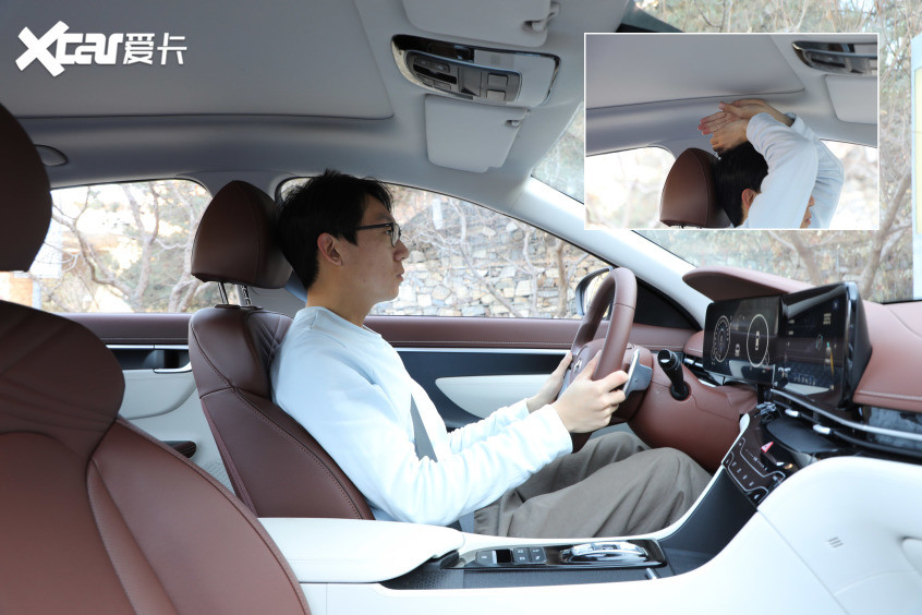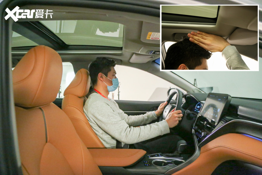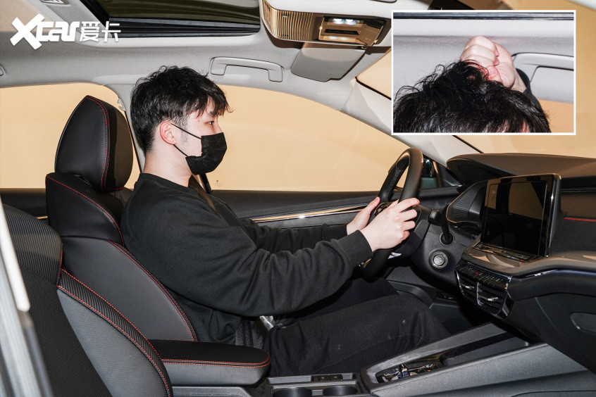 身高180cm的体验者坐入前排,调整至适合驾驶的位置之后(座椅最低位),头部还有2指余量,表现中规中矩。
