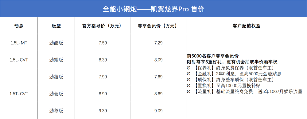 7月20日晚,“全能小钢炮”炫界Pro 燃擎上市。新车推出1.5T+CVT、1.5L+CVT,以及1.5L+MT三种动力总成,共计5款车型,提供冰晶白、炫动红、深海蓝、风清蓝、冷砂灰5款纯色车身及4款双色车身可选,尊享会员价7.29万元——9.09万元。