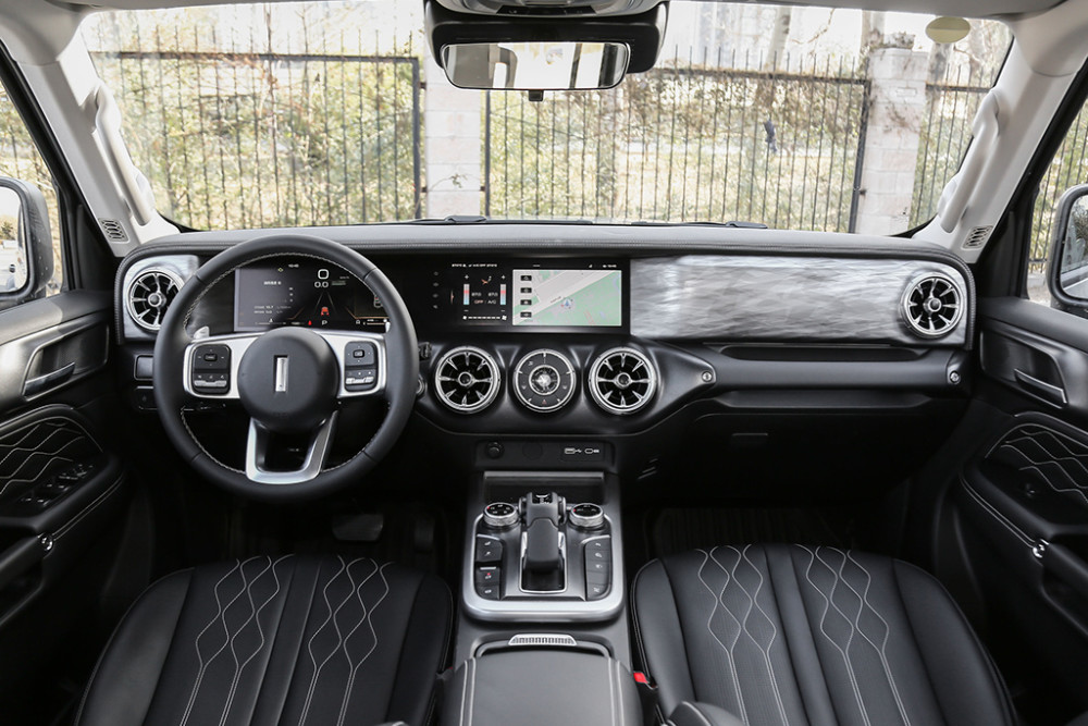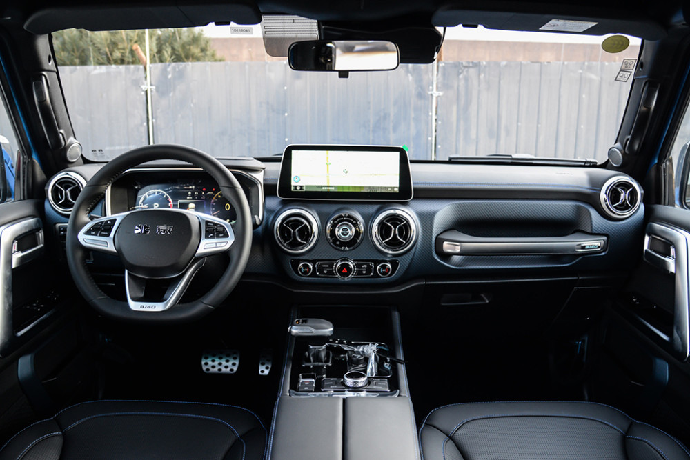内饰整体的设计很硬派,整体的布局很规整,车内采用银色镀铬饰板进行点缀。10英寸的中控屏幕反应流畅,虽不支持百度CarLife和苹果CarPlay的功能,但原车已经有语音识别和智能互联系统,并且越野中很重要的DVR功能涵盖其中。