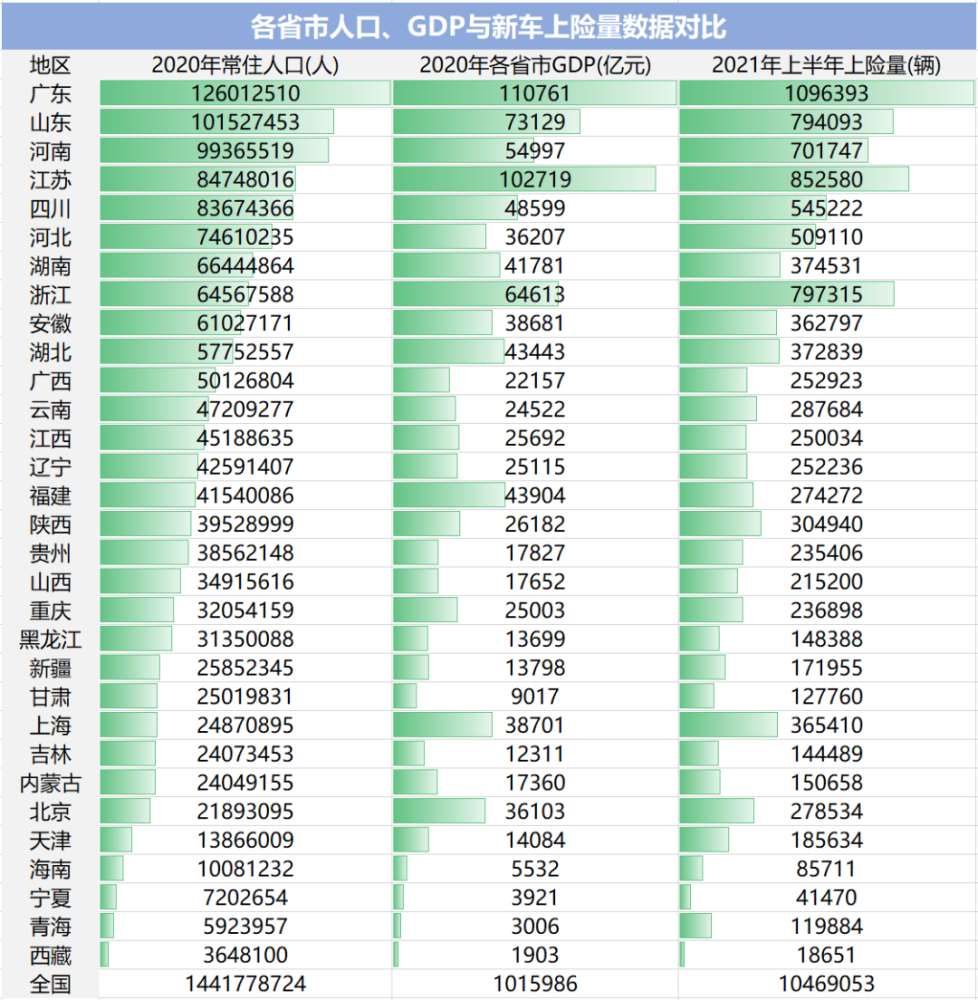 决定一个地区汽车销量规模的,应该有两大因素——人口和经济。前不久国家第七次人口普查结果已经公布,对应同时期2020年各省市自治区的GDP数据,可以看出各地区的经济发展差距还是很明显的。