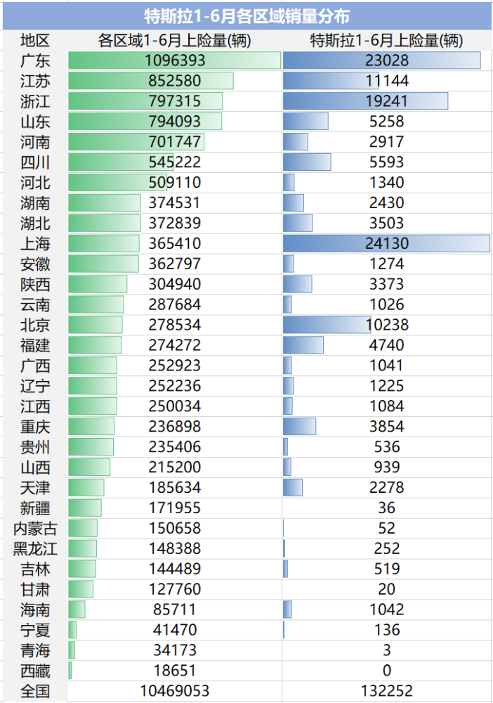作为新造车势力的代表车企,特斯拉的销量分布和整体市场差异明显,整体市场规模排名第十的上海,成为特斯拉最大的区域市场,销量甚至超过了包含广州、深圳两个一线城市的广东省。