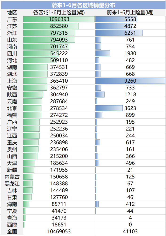 通过表格可以看出,虽然蔚来目前是最受关注的新造车势力品牌之一,但是在北上广江浙之外的广大地区,蔚来的实际市场影响力还非常有限。