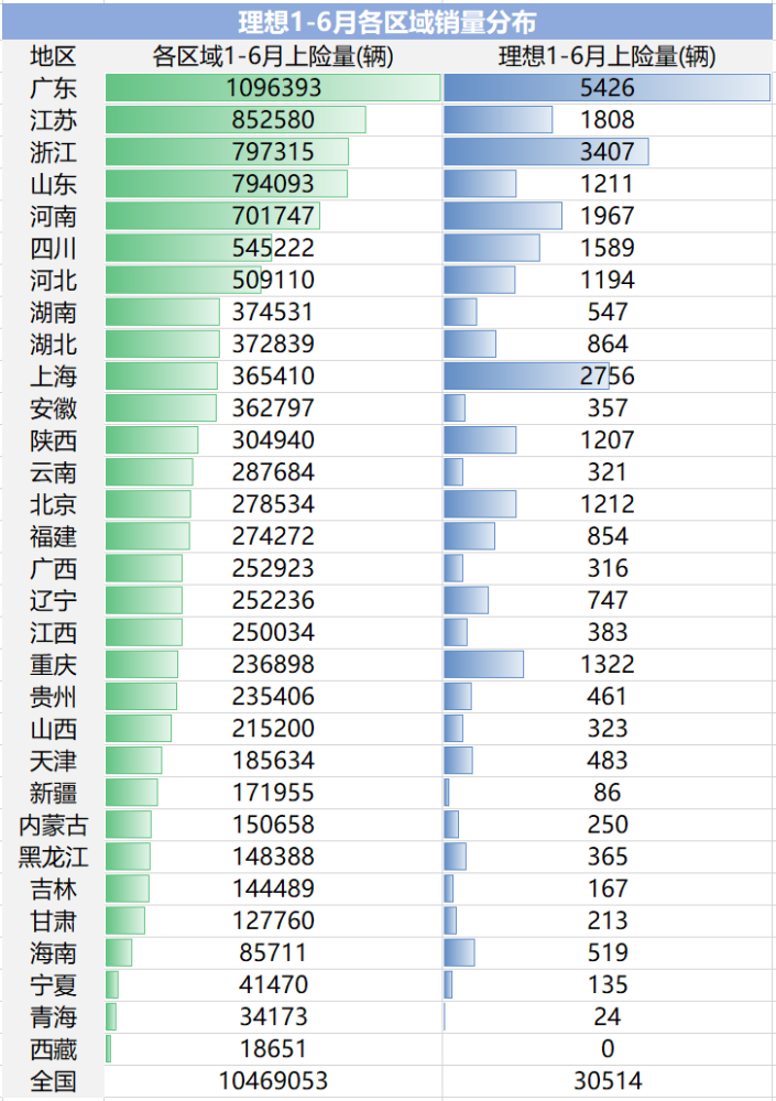 来到理想汽车,排名前五的区域市场依次是广东、浙江、上海、河南和江苏,可以看到,来自华中地区的欠发达省份,第一次挤进了Top 5,而且这5个市场的整体销量,在理想全国总销量中的占比只有50%,排在之后的四川、陕西、河北等省份,销量规模和前五地区的差距也并不算大。