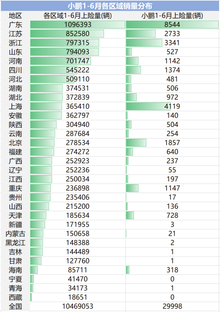 上面提到蔚来在上海销量超过两成,而小鹏对于其大本营广东省的依赖度更高,上半年累计销量在全国总销量中的占比,达到了28.5%,销量是第二大区域市场上海的两倍。