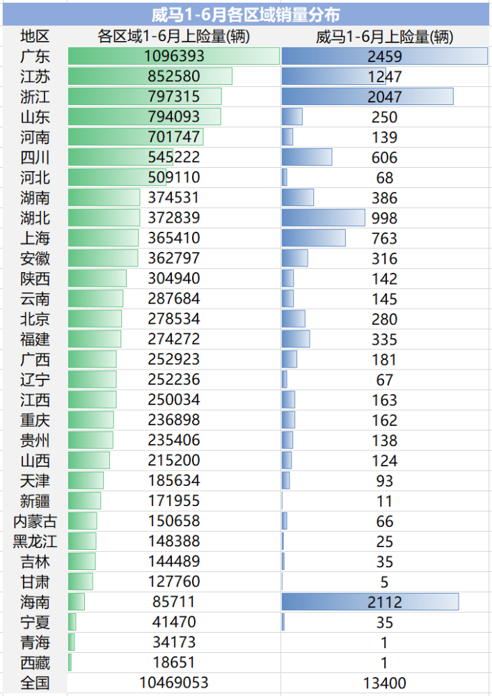 相比之下,威马在北京、上海两个城市的销量就少了很多,尤其是北京,上半年累计上险量只有280辆,甚至不及其在福建、湖南、安徽等地的销量。