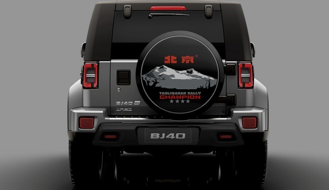 新一代BJ40环塔冠军版车门上的专属拉花、冠军徽标,硬朗、稳健,配合“TAKLIMAKAN RALLY”字样,冠军身份耀眼。而酷黑格栅和酷黑轮辋,将越野的潮酷进行到底,不惧剐蹭的特性,让人可以放开手脚尽情去野。辉煌星级备胎罩以塔克拉玛干沙漠中的景观——远山和胡杨为设计灵感,下方绘有“TAKLIMAKAN RALLY”、“CHAMPION”、四颗星以及“北京”红色LOGO的搭配,提升车尾品牌识别度。
