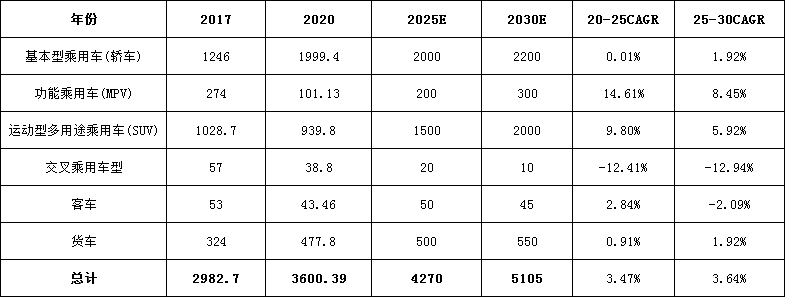 中国汽车工业中经过了数年的发展,汽车工业规模发展快速,加之中国汽车工业抓住了新能源的稻草,从而步入了发展的快车道。对于未来来说,隆众咨询认为,考虑到中国经济体量的增长,以及中国社会发展的变革,中国汽车工业仍将保持高速增长的趋势,特别是新能源汽车的加入,更加速了这一趋势的发展,预计2021年至2030年期间内,中国汽车工业产量增速约在4%,与中国GDPE增长速度基本吻合。