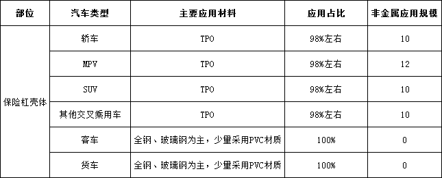 中国主要汽车车型前后保险杠非金属材料应用占比