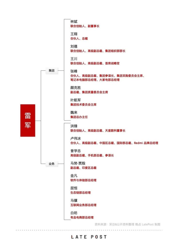 具体业务层面,则有 9 人向雷军直接汇报,覆盖小米每一个业务板块,包括:天星数科董事长洪锋、中国区总裁 & 国际部总裁 & Redmi 品牌总经理卢伟冰、手机部总裁曾学忠、印度区总裁马努·贾殷、软件与体验部总经理金凡、生态链部总经理屈恒、互联网业务部总经理马骥、业务中台部总经理仇睿恒和有品电商部总经理白昉。