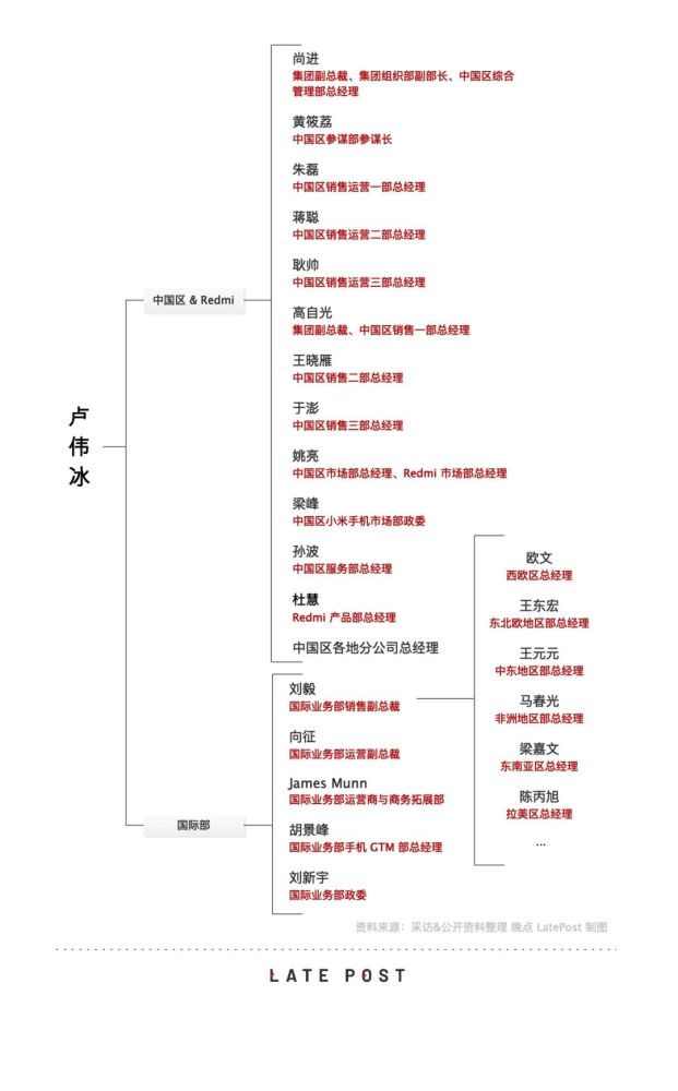 据《晚点 LatePost》了解,除遍布全国的数十名地方公司总经理外,有 17 人在业务层面上向卢伟冰直接汇报,包括中国区销售一部总经理高自光和中国区综合管理部总经理尚进两位小米副总裁,小辣椒手机创始人、中国区销售二部总经理王晓雁,以及销售运营一部总经理朱磊、国际部政委刘新宇等小米早期员工。