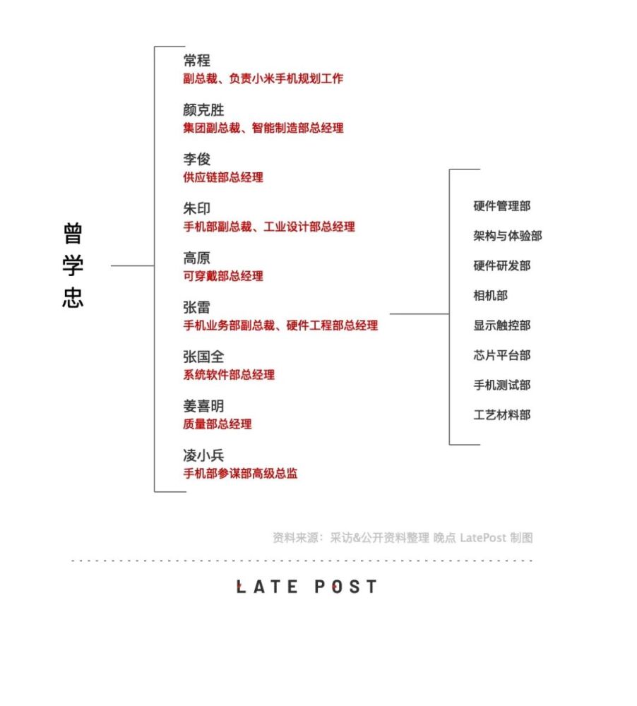 据《晚点 LatePost》了解,手机部有 9 人在业务层面上直接向曾学忠汇报,包括联想原副总裁、手机业务负责人常程,以及在小米工作超过 10 年的硬件工程部总经理张雷、系统软件部总经理张国全、智能制造部总经理颜克胜(颜克胜也直接向雷军汇报)等人。