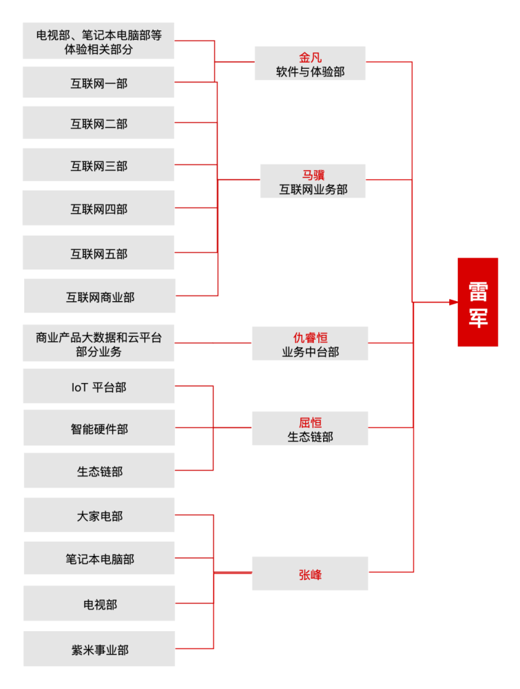 2018 年上市后不久,小米启动了成立以来最大的一次组织架构调整:联合创始人刘德、洪锋、王川和副总裁尚进负责的生态链部门、MIUI、电视和互娱业务四块业务被重组为十个一级部门,由一批以 80 后为主的年轻高管分别负责,直接向雷军汇报。