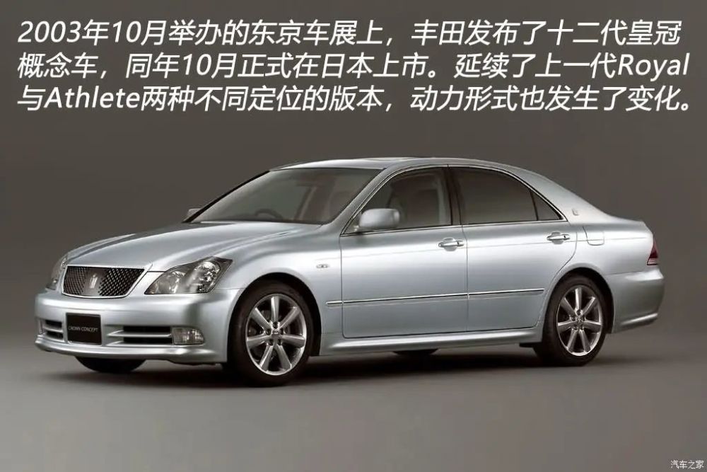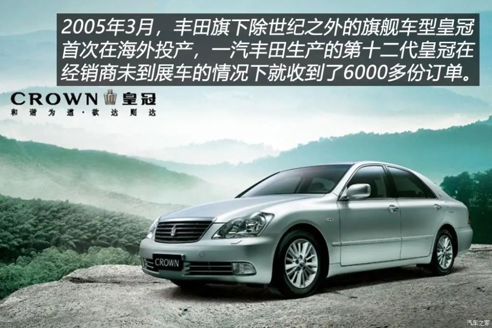 丰田在中国投产的第一款轿车是2002年下线的VIOS威驰,而有着良好群众基础的皇冠从第九代开始一直到第十一代都缺席中国市场。2003年底,日本消费者迎来了皇冠的第十二代车型,这代皇冠依然延续之前一贯的沉稳、大气形象。全新平台下诞生的十二代皇冠放弃了从九代到十一代车型一直使用的JZ系列直列六缸发动机,GR系列V6发动机从这代皇冠开始被发扬光大。2005年3月,第十二代皇冠终于在一汽丰田正式投产了,下线之前各地经销商在没有展车的情况下就接到了6000辆的订单,这足以说明皇冠曾在中国消费者心中留下的良好口碑。