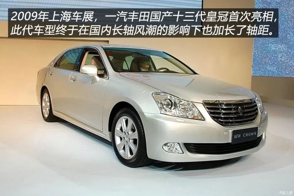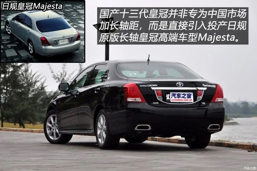 2009年上海车展,一汽丰田引入国产的十三代丰田皇冠首次亮相,考虑到当时国内消费者对长轴距车型的喜好,一汽丰田表示此代皇冠轴距将会加长,整车尺寸都将优于当时的奥迪A6L,几乎是一款专为中国市场打造的中大型豪华轿车。然而与日规皇冠对比后你会发现,国产十三代皇冠外观就与日规皇冠并不一样,原因是一汽丰田并非在日规皇冠的基础上加长轴距,而是直接引入投产了皇冠Majesta!Majesta是丰田从第九代皇冠开始推出的衍生车型,定位鉴于标准版皇冠和雷克萨斯LS之间,与皇冠的最大差异是Majesta加长了轴距并配备V8发动机,舒适性和配置方面更加出色。
