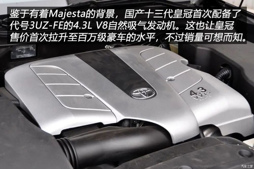 日规十三代皇冠继续沿用上一代车型的动力系统,那一汽丰田会不会趁着车型换代将国内消费者呼声很高的V6直喷发动机引入呢?答案是想都别想!国产十三代皇冠和海外车型一样沿用上一代车型动力系统,所以我们看到的依然是代号5GR-FE的2.5L和代号3GR-FE的3.0L V6自然吸气发动机,理由还是国内油品质量不稳定……前面提到此代国产皇冠顶配车型价格接近百万了,是因为这代皇冠首次配备了代号3UZ-FE的4.3L V8自然吸气发动机,最大功率285马力,最大扭矩420N·m,这台发动机在日本本土是为Majesta i-Four四驱车型所使用,而这台发动机在上一代Majesta车型上就开始使用了,不过有买这款香喷喷的V8皇冠这些钱,当时有更多更有面子的选择啊!