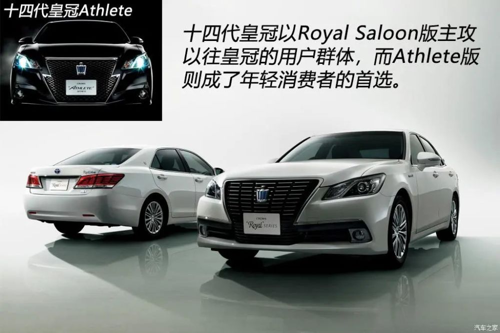 时间来到2012年底,代号S210的皇冠第十四代车型在日本上市,Athlete版的闪电前脸更加符合年轻消费者的喜好,Royal Saloon版则主攻原先皇冠的用户群体。上代车型的3GR-FSE 3.0L V6发动机不再沿用,仅保留了代号4GR-FSE的2.5L V6发动机,Athlete仍保留了代号2GR-FSE的3.5L V6发动机,6速手自一体变速箱升级为8速,Royal Saloon和Athlete版全部提供混动车型供消费者选择。2014年,国产第十四代皇冠在广州车展首发,此代车型依然基于日规Majesta打造,但用一汽丰田官方解释是外观根据中国消费者喜好进行了重新设计,中国消费者挠头“啥?我又被代表了?”