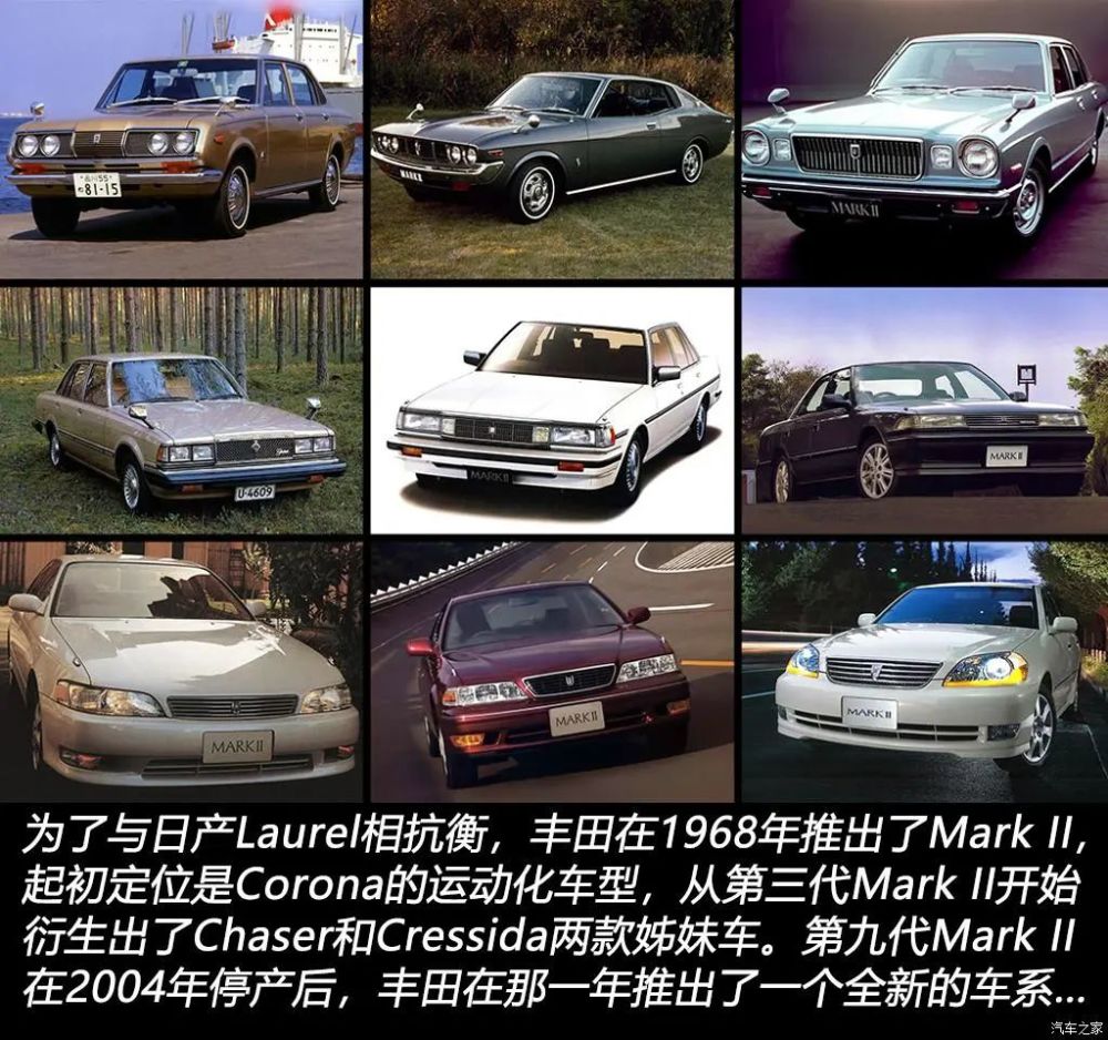 聊完了皇冠,我想大家不用猜都知道接下来出场的是谁了。主角出场前先铺垫一下。丰田在1968年推出了Mark II,丰田打造这款车主要是为了与第一代日产Laurel较劲,Mark II定位于当时的光冠(Corona)和皇冠之间,属于Corona的运动化车型,因此最初名为Corona Mark II。1976年的第三代车型直接采用Mark II命名,为了抢占细分市场,丰田基于第三代Mark II还推出了Chaser和Cressida两款姊妹车。到了第四代Mark II,丰田再推一款名为Cresta的姊妹车,这时基于Mark II推出的一系列车型也到达了鼎盛时期。第五代Mark II开始批量进入中国市场,但从第六代车型开始直到第九代也是Mark II的最后一代都与中国消费者基本无缘了。