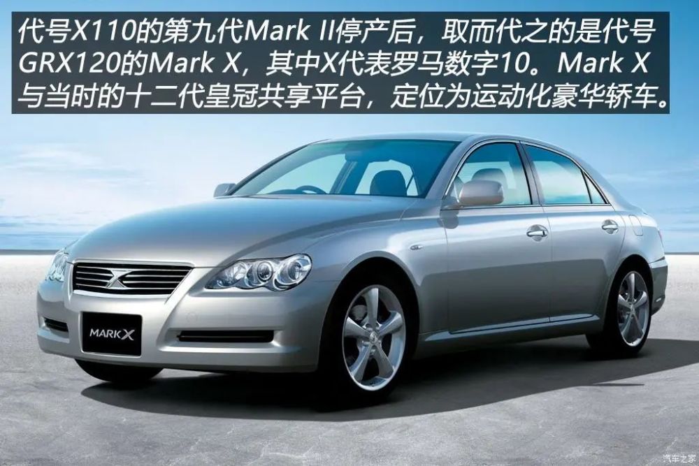 第九代Mark II停产的同时,丰田在2004年11月发布了其继任车型Mark X(GRX120),Mark X中的“X”即罗马数字10,意为Mark II后续的第十代车型。这次丰田大胆地将运动型轿车与豪华轿车的设计语言合二为一,尤其是Mark X后保险杠与排气管整合在一起的设计,在它之后的皇冠和雷克萨斯LS都沿用过这种风格。初代Mark X与十二代皇冠同平台打造,为了提升操控性从而进行了轻量化设计,这种改进也应用在了当时的雷克萨斯IS和GS上。初代Mark X共享十二代皇冠动力系统,提供215马力的2.5L V6(4GR-FSE)和256马力的3.0L V6(3GR-FES)发动机,与之匹配的是6速手自一体变速箱,同时Mark X和皇冠一样还提供四驱车型,而四驱版则使用5速手自一体变速箱。