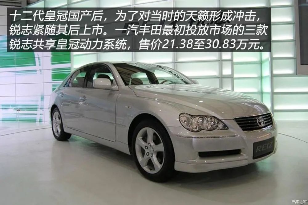 十二代皇冠投产的七个月之后,初代Mark X也由一汽丰田在2005年10月引入国产了,在中国还有了个新名字——REIZ锐志。一汽丰田引入Mark X主要是看中这款车在当时日本市场的丰田品牌所有车型中销量排名第三位,锐志国产后将对国产日产天籁形成冲击,而同门师兄十二代皇冠则冲击奥迪A6L的市场份额。锐志最初上市时三款车型分别为2.5S、2.5V和3.0V PREMIUM,售价21.38至30.83万元,配备与十二代皇冠相同的2.5L和3.0L V6自然吸气发动机。上市之初,锐志在宣传上一直主打运动牌,只要是跟运动沾边的合资和进口车型都是它的竞争对手,因此在消费者眼中这是一款性价比极高的运动轿车。