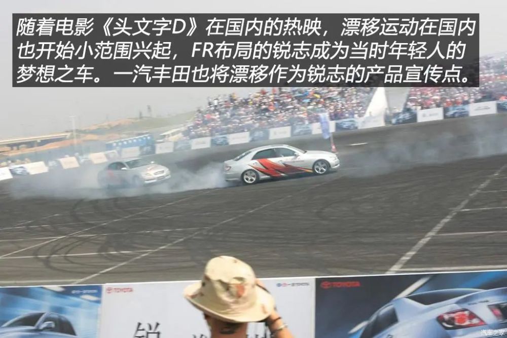 锐志上市初期就给消费者灌输了一个概念,V6发动机+FR前置后驱布局=运动轿车,这种标杆的打造让当时很多人冲“运动”二字成为锐志车主。此外,根据同名动漫作品改编的电影《头文字D》2005年6月在全国上映,漂移运动的兴起也让不少人把锐志奉为神车,一汽丰田举办的锐志试驾活动也围绕“操控性”和“漂移”主题的在全国各地展开,锐志可以说是当时国内合资中级车市场上唯一的FR轿车,几乎没有竞争对手的它在上市之后的几年内顺风顺水赢得了消费者的广泛认可。2006年11月,丰田在日本推出Mark X的小改款车型,除了外观的细微变化外,AVS自适应可变悬架系统的加入让Mark X似乎在运动性方面有点把握了,不过这项配置并没出现在当时的国产锐志上。