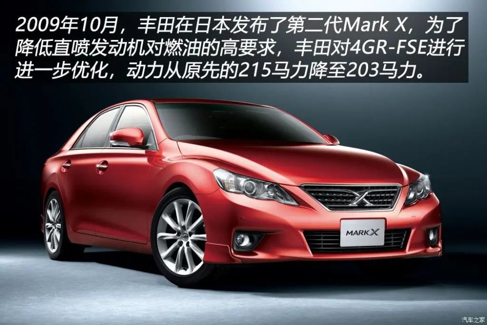 在初代Mark X上市五年后,丰田于2009年10月在日本发布了第二代Mark X。外观的变化显而易见,初代车型后杠与排气集成的设计并未得到延续。第二代Mark X沿用上代车型的平台,代号4GR-FSE的2.5L V6发动机继续使用,经过调校后的动力水平从之前的215马力降为203马力,优化主要是为了适应更低标号的燃油。上代车型的3.0L V6发动机被代号2GR-FSE的3.5L V6发动机所取代,不管是后驱还是四驱车型全部统一配备6速手自一体变速箱。丰田并未将当时皇冠的混动系统应用在到Mark X上,或许是为了保持Mark X运动化的纯粹定位。