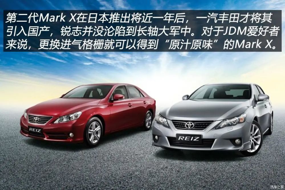 当日本本土的Mark X已经换代时,一汽丰田仍然在生产和销售上一代车型,时隔将近一年后,第二代Mark X终于来到中国了。2010年9月,一汽丰田国产第二代锐志正式上市,最初上市的七款车型共有两种动力组合,售价区间20.98至32.68万元。与换代后的十三代皇冠不同,主打运动化定位的锐志并未加入当时国内流行的“长轴大军”中,前面提到了第二代Mark X仍采用十二代皇冠的平台,所以轴距方面和初代Mark X保持一致仍然是2850mm。另外一点值得肯定的是,一汽丰田并未对锐志的外观进行本土化设计,和初代锐志一样,很多钟爱JDM文化的车主只需要更换X车系标识的进气格栅就行。