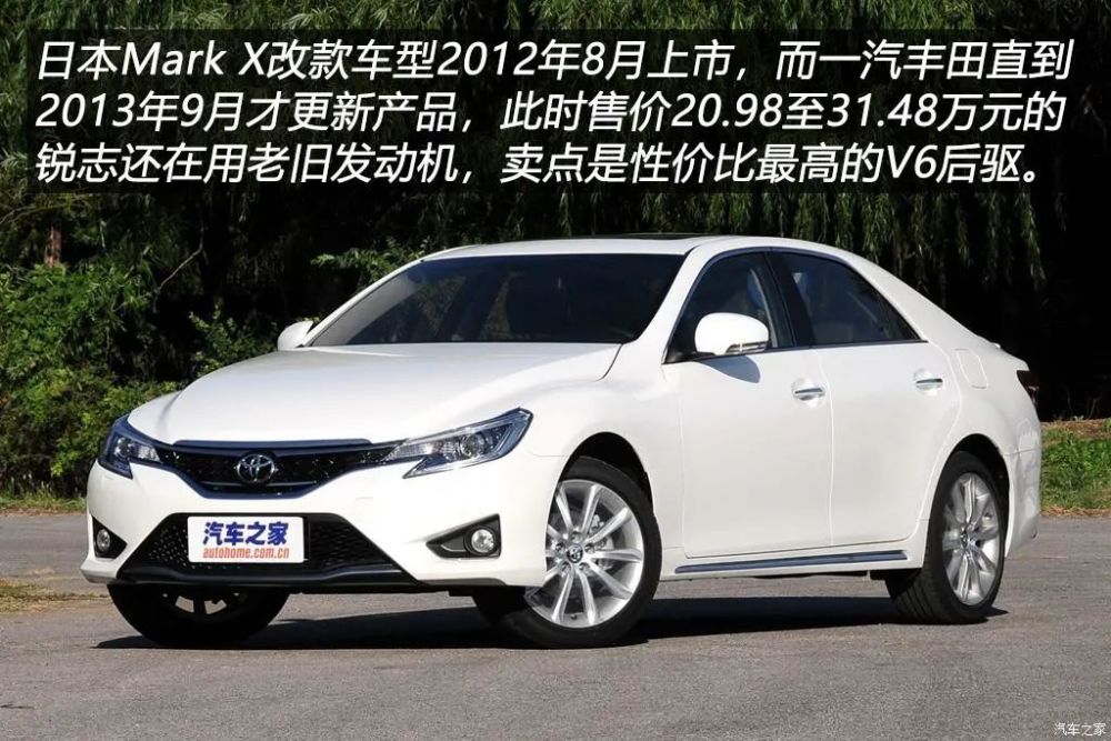 2012年8月,丰田在日本本土推出了第二代Mark X的改款车型,新车的变化主要来自前脸和尾灯,大灯内嵌的灯带会让人误以为是日间行车灯,其实仅仅是示宽灯。除了外观的变化外,内饰仍然保持原样,但喜人的是丰田老气横秋的绿色中控背光换成了蓝色。虽然Mark X仍未加入丰田在日本普及度很高的混动系统,但改款车型增加了减振材料用来提升静音性,增加焊点用来提升车身刚性,这些细节的变化都是消费者无法观察到的。国内消费者始终期盼着锐志能同步引入日规车型的直喷发动机,然而随着改款锐志在2013年9月上市,大家的希望再一次落空,上市后售价20.98至31.48万元的七款车型用的发动机代号大家都能倒着写出来了。