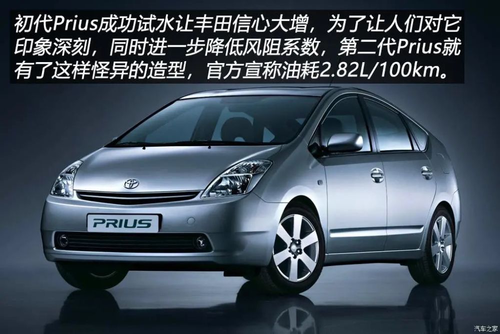 有了第一代Prius的成功试水,继任车型的研发也因此被提上了日程,设计师决定将第二代Prius打造成一款让人过目不忘的车型,他摒弃了上一代车型三厢车的设计理念,实用性更佳的五门掀背造型成为第二代Prius最大的特点。更加合理的空气动力学设计使得第二代Prius风阻系数仅为0.26cd。第二代Prius依然出自丰田MC平台,并且沿用了上代Prius代号1NZ-FXE的1.5升四缸自然吸气发动机,这台发动机具有VVT-i可变正时气门技术,最大功率77马力,最大扭矩115N·m,500V电动机最大功率50kW(约合68马力),综合扭矩400N·m,混合动力净功率112马力,配备ECVT无级变速箱,官方给出的理论油耗为35.5km/L(约合2.82L/100km)。