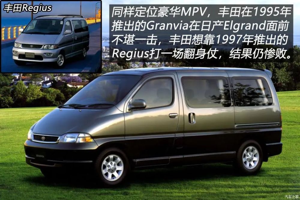 1997年,日产在日本推出了名为Elgrand的MPV,这款空间宽敞、配置豪华且驾乘舒适的“大面包”出现后,颠覆了人们对于面包车等同于工具车的印象。Elgrand推出后大获好评,丰田1995年推出的Granvia在它面前就像个小弟弟不堪一击,于是丰田准备打一场翻身仗,在1997年推出了定位更豪华的Regius,但丰田的双车战略并未撼动Elgrand的地位,于是丰田摩拳擦掌决定好好跟日产硬磕一下了……