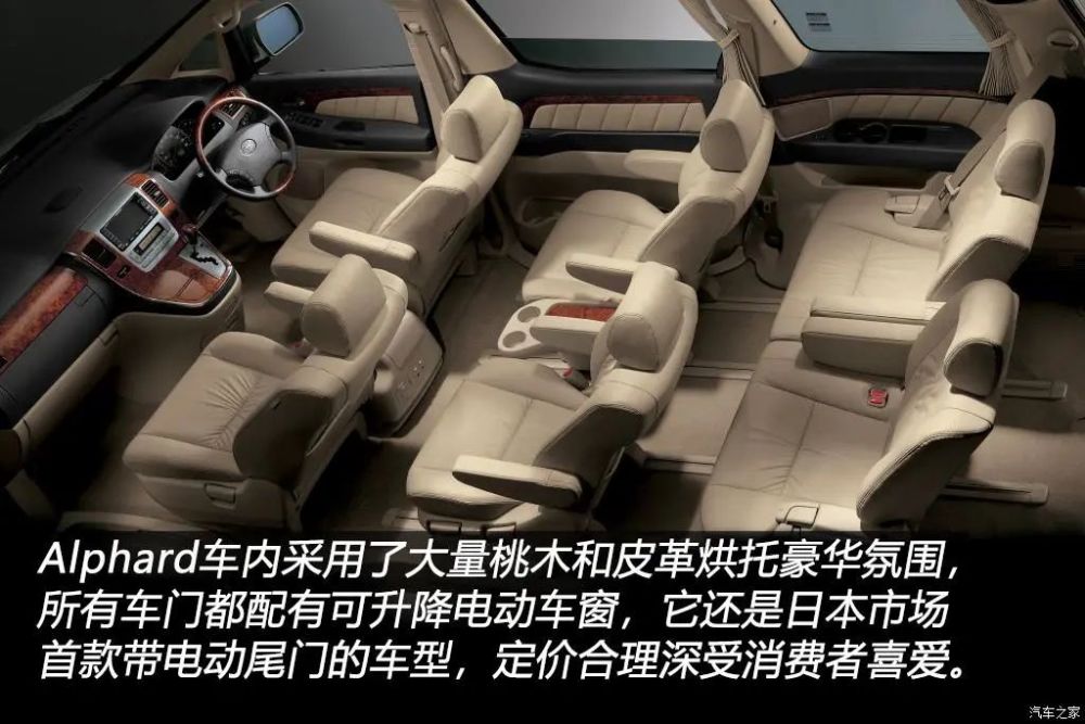 丰田给初代Alphard的定位是比以往的豪华再豪华一点,为了把竞争对手第二代Elgrand赶下神坛,Alphard车内采用了大量桃木和皮革烘托豪华氛围,同时配置也非常丰富了,所有车门都配有电动车窗(侧滑门车窗可升降)、可选装电动侧滑门。对了,初代Alphard还是日本市场上第一款配备电动尾门的车型,同时也是日本市场首款配备自适应巡航的MPV,后排娱乐系统也是Alphard的卖点之一。动力方面,初代Alphard共享Estima那台代号2AZ-FE的2.4L直列四缸自然吸气发动机,最大功率159马力,此外还提供代号1MZ-FE的220马力3.0L V6自然吸气发动机,与发动机相匹配的是4速和5速自动变速箱。2003年7月,初代Alphard增加了混动车型。尽管初代Alphard定位豪华MPV,但合理的售价深得日本消费者的认可,日产傻眼了。