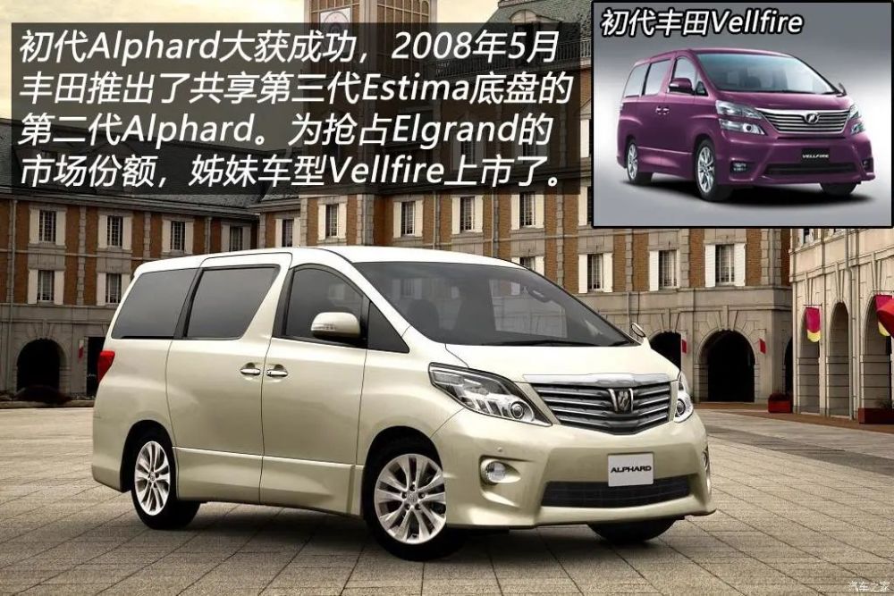有了初代Alphard打下的市场,丰田在2008年5月推出了第二代车型,此代lphard与第三代Estima共享底盘,继续沿用上一代车型的2.4L四缸发动机外,还采用了与Estima相同的代号2GR-FE的3.5L V6自然吸气发动机,2.4L车型使用CVT变速箱,而3.5L则使用6速手自一体变速箱,混动车型继续沿用上代车型的发动机。除维持原先的配置水平外,丰田还为这代车型配备了可视智能停车辅助系统,即便女性用户也可以驾驭体型庞大的Alphard轻轻松松地停车了。此外,为了巩固丰田在日本豪华MPV市场的地位,丰田在第二代Alphard的基础上推出了姊妹车型Vellfire。Alphard主打优雅和豪华,而更有个性的Vellfire主打休闲运动风格,虽然一款MPV跟运动没什么关系吧……