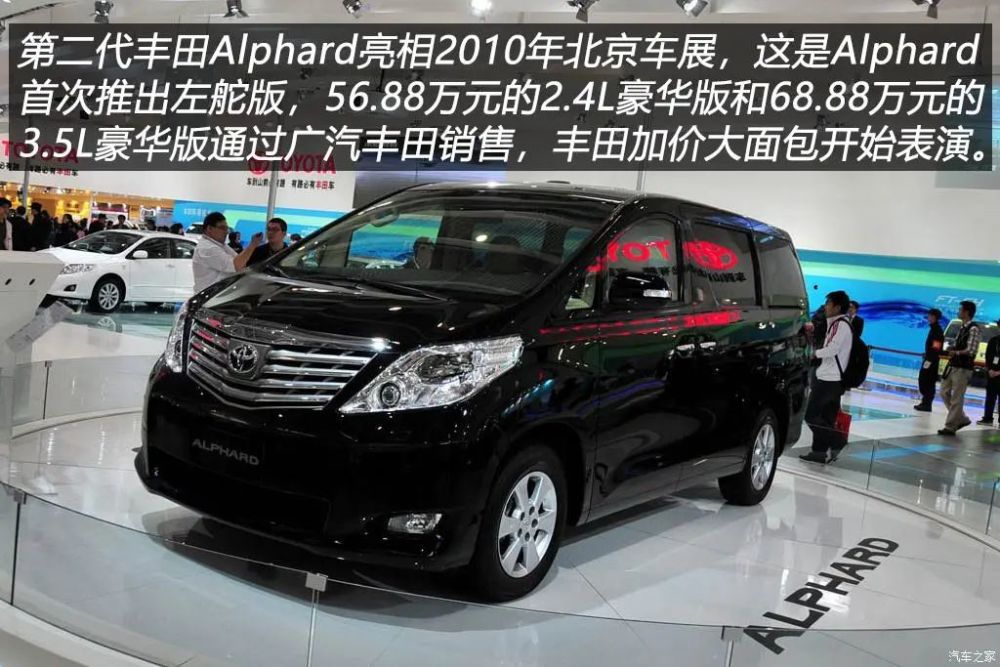 重点来了!2010年4月的北京车展上,第二代Alphard出现在了丰田展台上,当时丰田在国内MPV车型仅有一款售价46.98至61.1万元的普瑞维亚,Alphard的出现可以说填补了丰田在国内高端MPV市场的空白,意义更重大的是,Alphard这是首次推出左舵车型。2010年11月,进口Alphard正式在国内上市并且有了中文名称——埃尔法。通过广汽丰田渠道进行销售,上市的两款车型为售价56.88万元的2.4L豪华版和68.88万元的3.5L豪华版。当时埃尔法的最大卖点是各种舒适性配置,比如堪比飞机头等舱可多项调节角度的第二排座椅、第二排DVD娱乐系统等,当时国内市场埃尔法的主要竞争对手是福建戴姆勒生产定位唯雅诺和大众Multivan,不过这几款车都更偏向于商务用途,而埃尔法则兼顾了商务和家庭使用,旺盛的市场需求一下让这款豪华大面包火了。