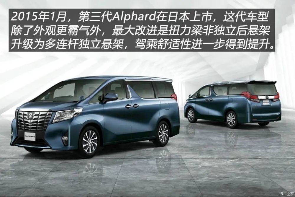 或许连丰田自己都没想到埃尔法在中国的人气能这么高。2015年1月,丰田在日本发布了第三代Alphard,轴距较上一代车型增加了50mm,达到了3000mm。这代Alphard外观相比上代车型简直是脱胎换骨的变化,前脸采用大面积镀铬彰目的是更加突显其豪华MPV的定位,以至于当人们最初看到它时还要适应一段时间才行。悬架方面,前轮仍是麦弗逊结构,而后轮由上代车型的扭力梁非独立悬架进化为带有副车架的多连杆独立悬架,进一步提升了乘坐舒适性。上代2.4L发动机被代号2AR-FE的182马力2.5L四缸发动机所取代,3.5L V6车型沿用上代车型的发动机,两者分别采用CVT和6速手自一体变速箱。