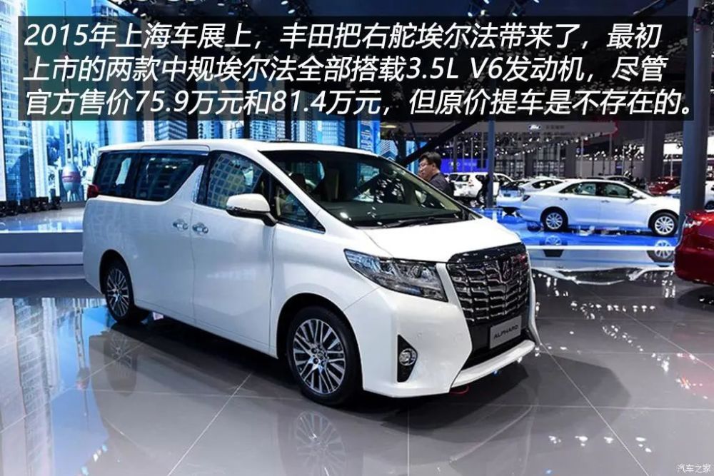 混合动力车型已经成为Alphard不可或缺的成员了,代号2AR-FXE的2.5L发动机+电动机的混动系统最大综合功率211马力,最大扭矩409N·m,匹配E-CVT变速箱,标配E-Four电控四驱。2015上海车展上,第三代埃尔法在国内进行了首发,虽然车展上展出的是一款日规右舵车型,但它的出现已经对豪车市场产生了影响,很多原本D级车的潜在用户会将剁手目标转移到埃尔法身上……同年6月,第三代埃尔法正式上市,最初投放市场的两款车型全部搭载3.5L V6发动机,豪华版和尊贵版售价75.9万元和81.4万元。想原价提车是不可能的啦,这辈子都不可能啦!