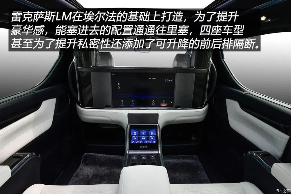 相比埃尔法增加了12.3寸中控屏幕、17扬声器马克莱文森音响、全景影像、自动刹车辅助功能、卡片钥匙、更舒适的座椅填充物、后排13.3寸车载电视等,四座版更是夸张到配备了前后排隔断、后排26寸车载电视、后排车载冰箱、后排座椅按摩、后排控制面板等。2020年2月,雷克萨斯LM正式上市,七座隽雅版和四座御世版售价116.6万元及146.6万元,据说四座版最高加价82万元,这里的据说是因为这种加价神器我根本不敢去4S店打听价格……
