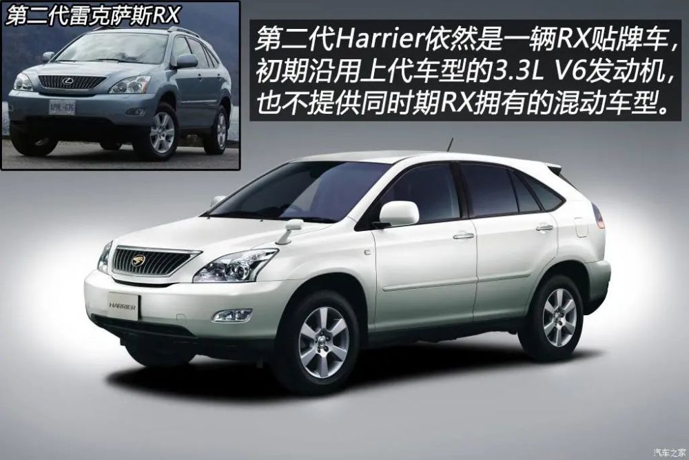初代Harrier与雷克萨斯RX都出自丰田九州工厂,除共享初代RX的220马力3.0L V6发动机外,还提供了代号5S-FE的140马力2.2L直列四缸发动机,驱动形式与RX一样分为前驱版和四驱版车型。2003年2月发布的第二代Harrier仍然采用换标第二代RX的老套路,第二代RX初期配备代号3MZ-FE的3.3L V6发动机,而第二代Harrier V6车型初期仍然延续上一代的220马力1MZ-FE发动机,直到2006年1月才与RX一同更换了280马力的3.5L V6发动机。第二代RX在北美市场深受消费者喜爱,2005年推出的RX 400h是当时首款采用混合动力的豪华SUV,不过日本市场的第二代Harrier并不提供混动车型。