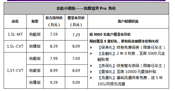 凯翼炫界自去年推出伊始,吸引了一波铁粉。昨日,凯翼汽车又推出“全能小钢炮”炫界Pro,新车共有1.5T+CVT、1.5L+CVT以及1.5L+MT三种动力总成,共计5款车型,提供冰晶白、炫动红、深海蓝、风清蓝、冷砂灰5款纯色车身及4款双色车身可选,尊享会员价7.29万元——9.09万元。